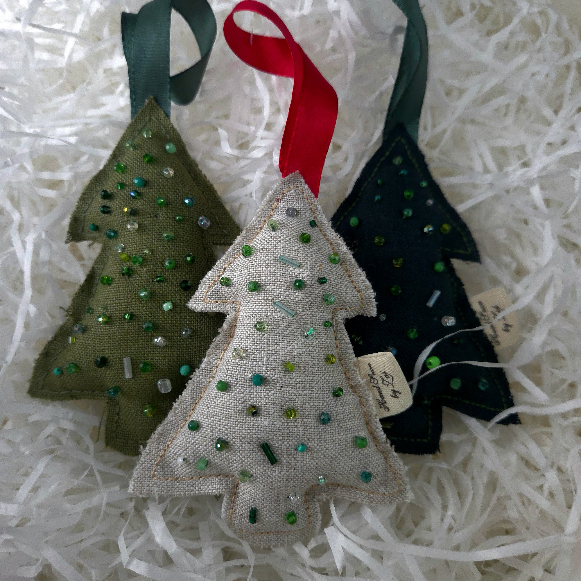 Each one is hand sewn, stitched, and unique. Glass beads are added to the linen surface when the little tree has been filled with stuffing, and an ethically sourced ribbon and label make the finishing touches.